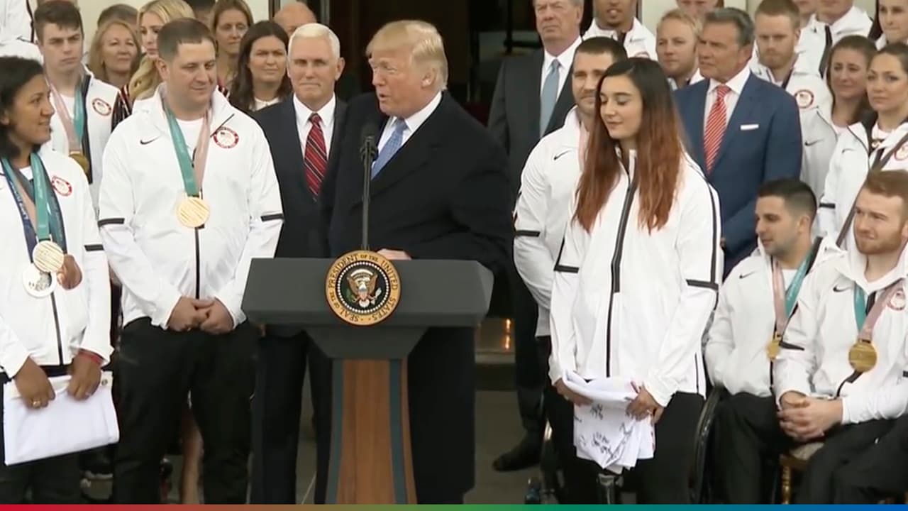 En plena conferencia, el presidente de EEUU empieza a recoger los brazos y esbozar un tono de voz extraño para tratar de imitar a una persona en condiciones especiales.