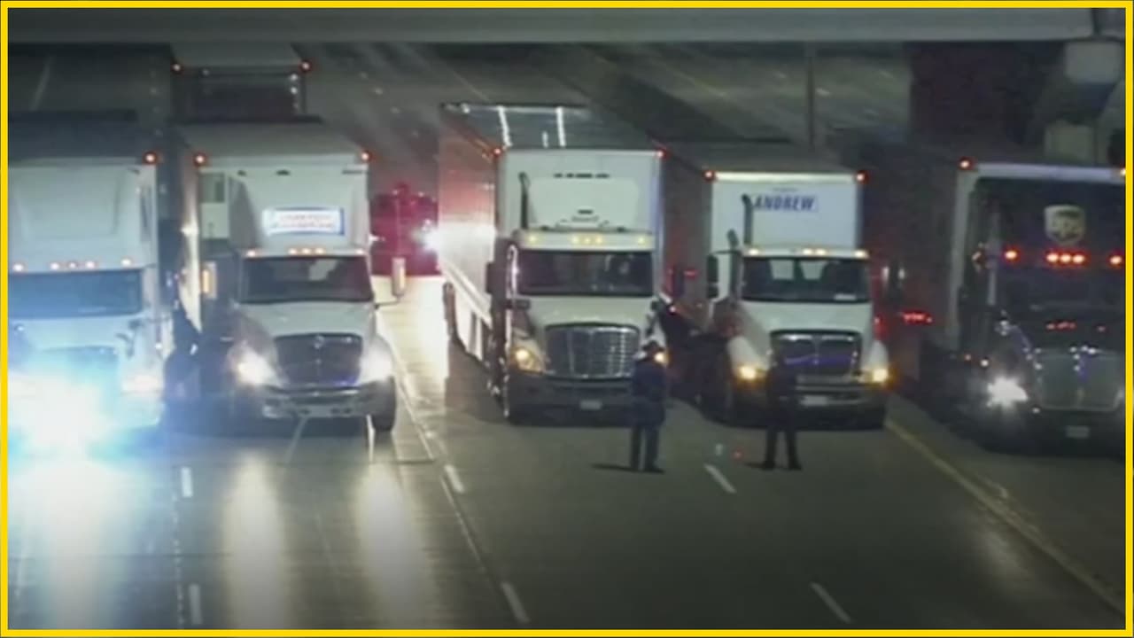 El grupo de camioneros colocaron sus trailers bajo un puente para bloquear el salto suicida en una carretera de Detroit.