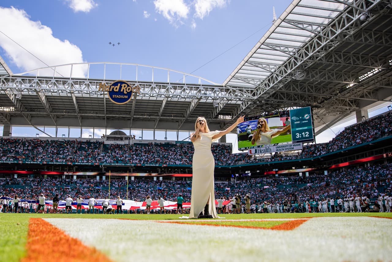 La cantante y compositora cautivó a los fanáticos y jugadores del Hard Rock Stadium de Miami con una emotiva interpretación del Himno Nacional en el juego Miami Dolphins vs. Denver Broncos. Antes de continuar, te invitamos a entrar a ViX, entretenimiento sin límites, con más de 100 canales, gratis y en español.