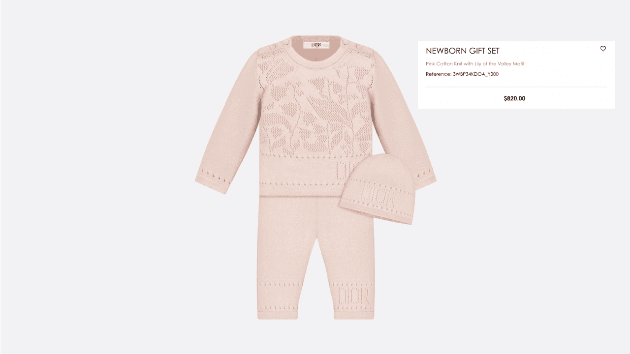 “El set de regalo para recién nacido presenta el delicado motivo calado Lirio de los Valles, la flor de la suerte emblemática de Christian Dior y símbolo de su amor por la naturaleza. El trío se compone de un pantalón de punto de algodón rosa, una camiseta de manga larga y un gorrito”, explican en la web oficial de la marca.