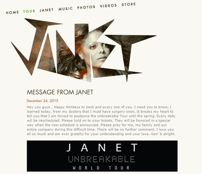 Janet Jackson anunció que ha pospuesto las próximas presentaciones de su gira mundial 'Unbreakable' porque será operada, aunque no precisó qué tipo de procedimiento quirúrgico le será realizado.
