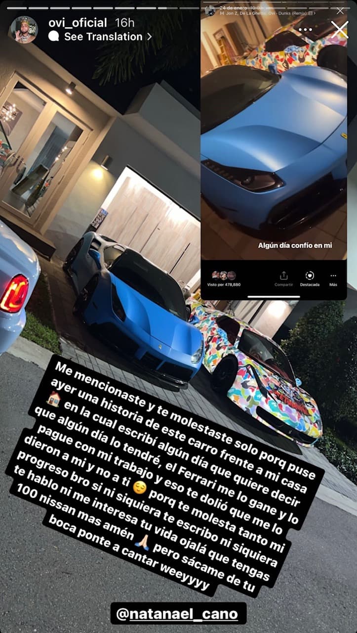 Entre muchos otros comentarios, Ovi alega que todo inició por envidia, cuando él compartió la foto de un auto de lujo frente a su casa: “El Ferrari me lo gané y lo pagué con mi trabajo y eso te dolió, que me lo dieron a mí y no a ti. Por qué te molesta tanto mi progreso, bro, ni siquiera te escribo, ni siquiera te hablo”.