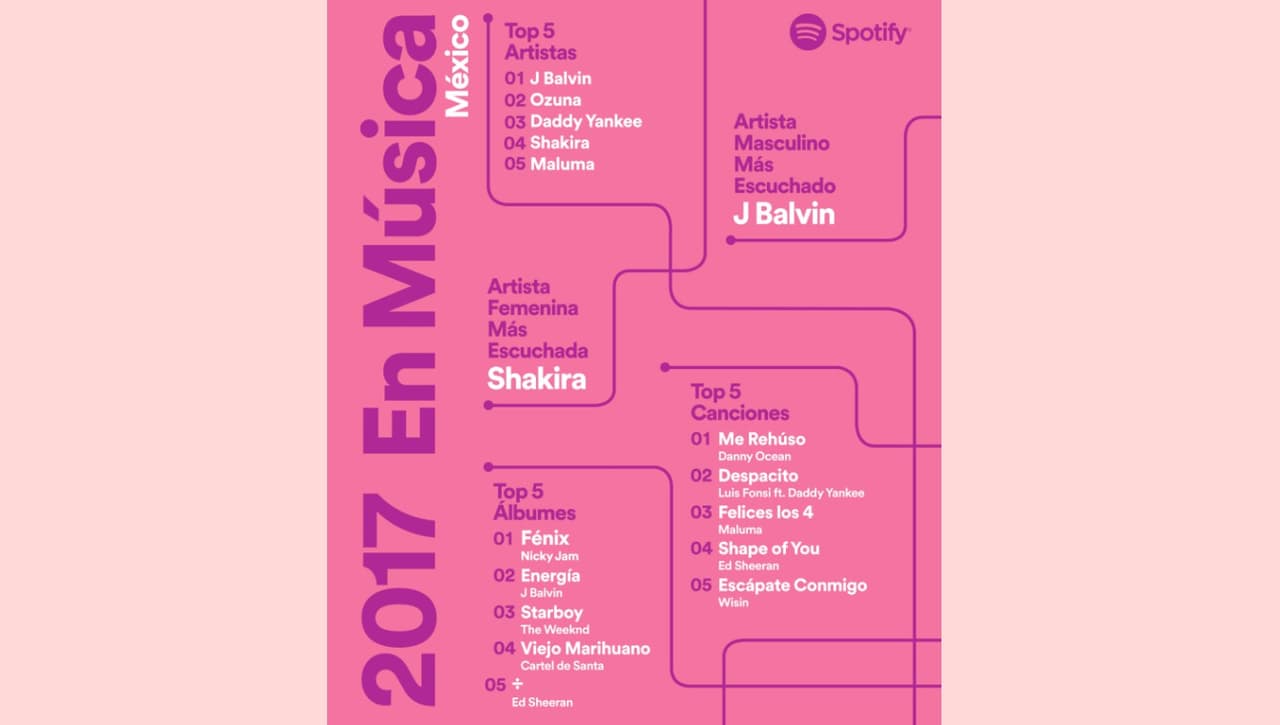 El colombiano J Balvin fue el artista masculino más escuchado en 2017 en México y Shakira la mujer con más reproducciones en esa plataforma en ese país. Los cinco artistas más escuchados en Mexico este año son todos puertorriqueños o colombianos y hacen reggaeton: J Balvin, Ozuna, Daddy Yankee, Shakira y Maluma. Cabe destacar que Ozuna es una estrella nueva, demostrando que en cuanto a reggaeton y trap latino se trata, la tendencia sigue en crecimiento. La razón por la cual Shakira es relevante: hace colaboraciones de reggaeton con Nicky Jam y Maluma.