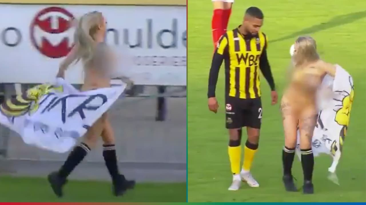 ¿Cuántos no ha tenido ganas de entrar al campo de juego para ver de cerca a sus ídolos de fútbol o simplemente salir en las cámaras de televisión? Pues una chica rubia lo hizo en la segunda división de Holanda. Sin embargo, no fue eso que la hizo viral, sino la forma en la que estaba vestida: lo único que llevaba puesto eran unas medias negras, como las de los futbolistas, y una bandera de su equipo.