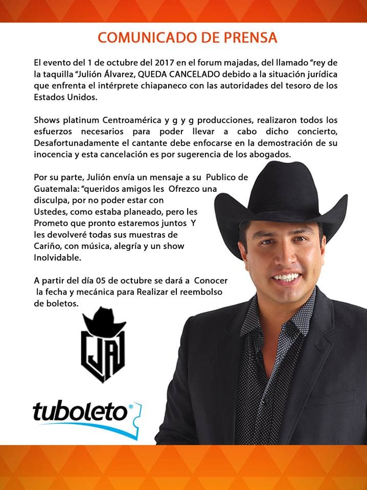 El concierto de Julión Álvarez en la capital de Guatemala, programado para el pasado sábado 1 de octubre, no fue cancelado por la situación jurídica que el cantante enfrenta con el Departamento del Tesoro de los Estados Unidos, tal como lo anunciaron los organizadores y varios diarios mexicanos.
