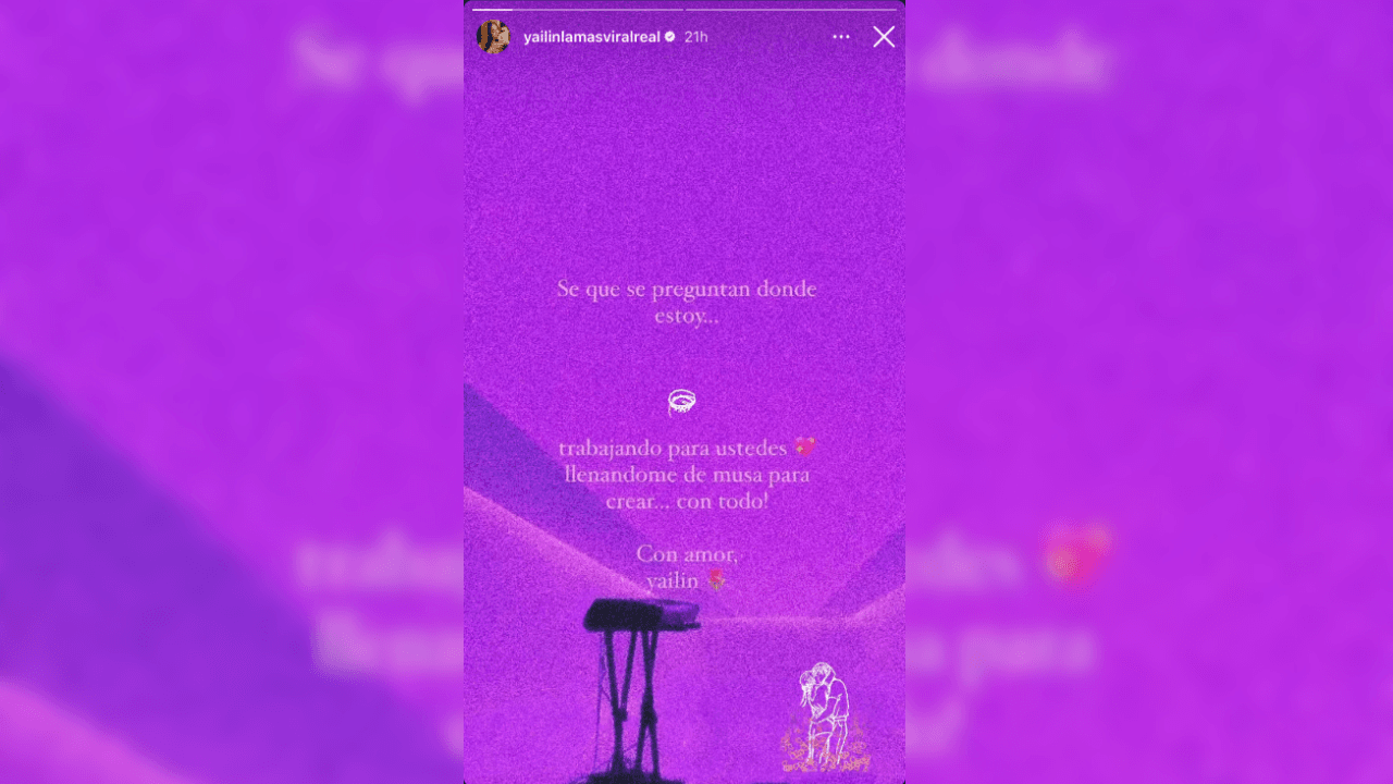 “Sé que se preguntan dónde estoy…trabajando para ustedes, llenándome de musa para crear… con todo! Con amor, Yailin”, reveló.