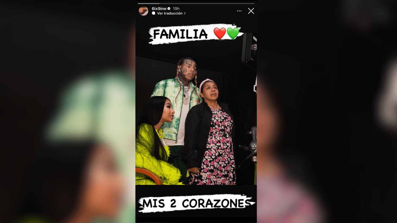 Tekashi publicó una imagen en Instagram en la que aparece junto a Yailin y su madre, con el mensaje “Familia” y dos corazones, uno rojo y otro verde.