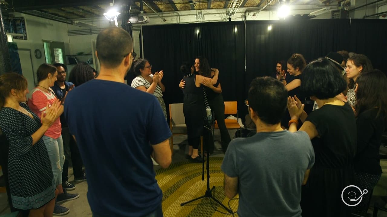 Refugees and immigrants come together to sing an improvised song with Eleni Arapoglou