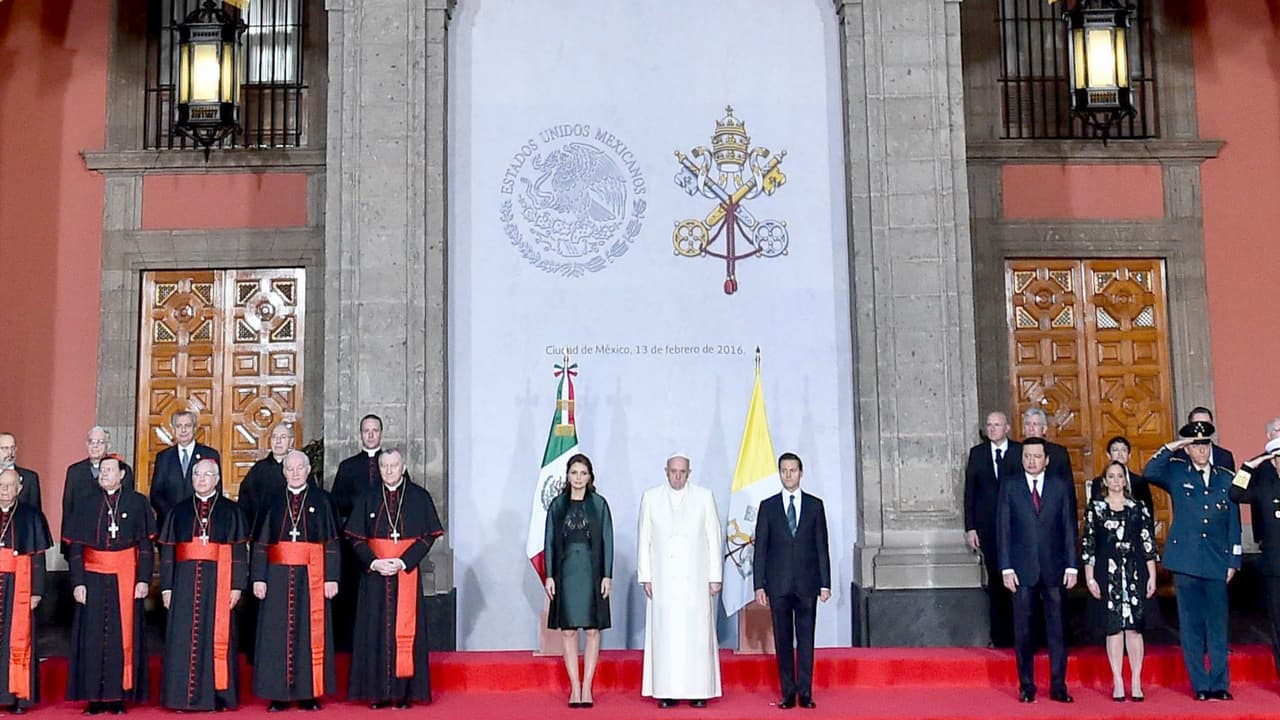 El Presidente de México, Enrique Peña Nieto, y su esposa, la Primera Dama Angélica Rivera, dieron la bienvenida oficial al Papa Francisco en Palacio Nacional, el recinto más importante del país.