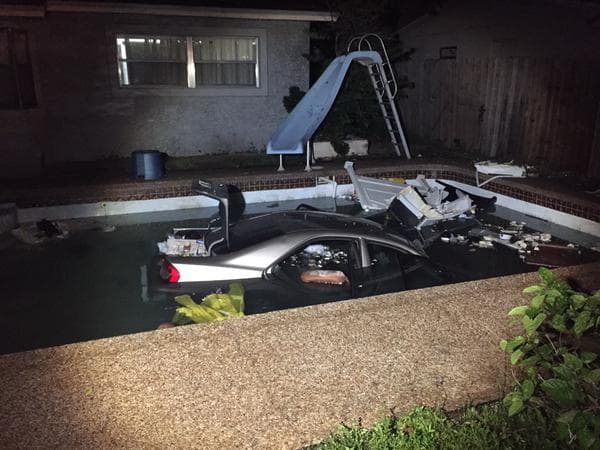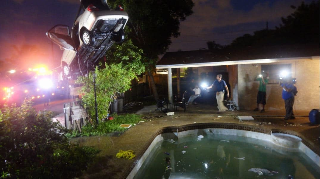 Según reportan varios medios, el vehículo, un Camry color bronce y de cuatro puertas, pasó por una valla de tela metálica, luego cruzó por el patio de una casa vecina, paso a través de una verja de madera de cinco pies de alto y por debajo de un patio cubierto, antes de terminar dentro de la piscina.