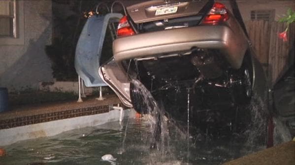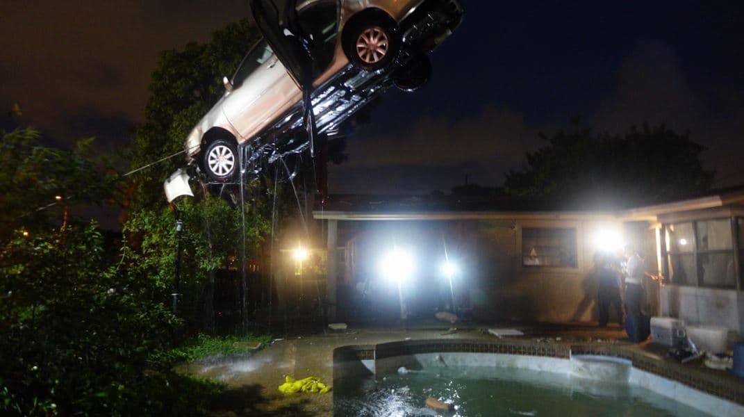Todo un misterio cómo un auto aterrizó en la piscina de una casa en Pompano Beach.