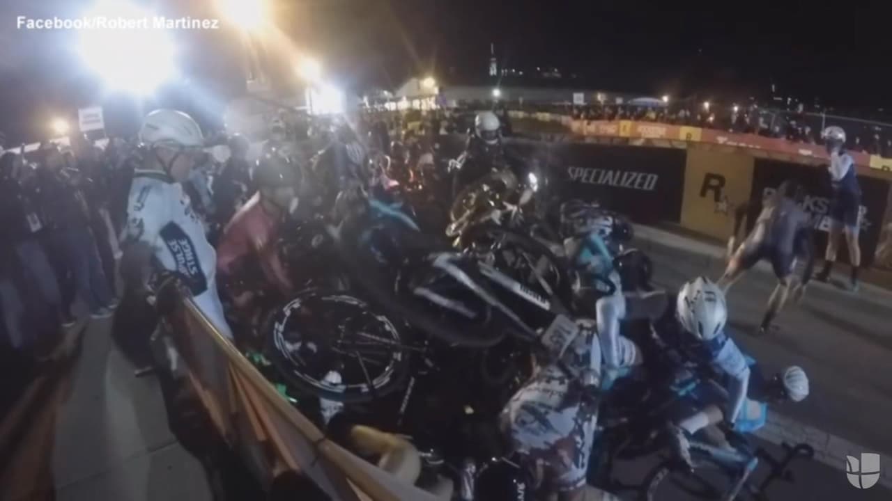 Por lo menos una docena de deportistas sufrieron el accidente al acercarse e intentar rodear la motocicleta pero el número de bicicletas superó la velocidad de respuesta.