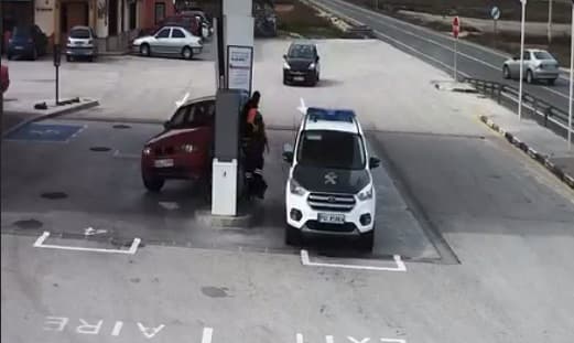 Las cámaras de seguridad captaron un vehículo entrando a toda velocidad y sin control a la gasolinera en la que dos agentes de la Guardia Civil española estaban repostando. "La suerte les salvó la vida", escribió en redes la Guardia Civil.