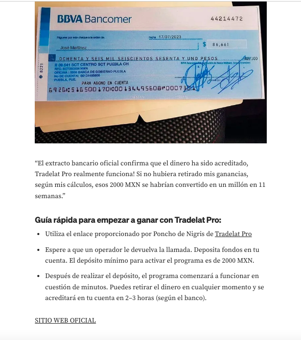 Pero la misma búsqueda en Google nos arrojó como resultado un artículo engañoso publicado en Medium, que plantea la pregunta de si la aplicación de inversión supuestamente promovida por De Nigris —exparticipante del reality show La Casa de los Famosos— es estafa o es real, pero que realmente contiene un texto falso de la presunta entrevista y un enlace a una supuesta aplicación de inversión llamada Tradelat Pro. De allí que también hay que tener cuidado de no caer en el fraude cuando se investiga sobre el mismo en internet.