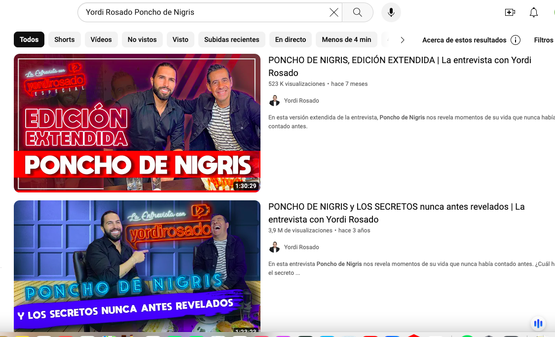 Por otro lado, una búsqueda en YouTube nos permitió confirmar que una de las imágenes compartidas en las publicaciones que estamos verificando corresponde a una entrevista entre Rosado y De Nigris, pues aparecen en el mismo set y con la misma vestimenta que en la desinformación. De ese encuentro hay dos versiones en la plataforma de video (una del año 2020 y otra un poco más larga de 2023), pero en ninguna de ellas se habla de un gran secreto financiero.