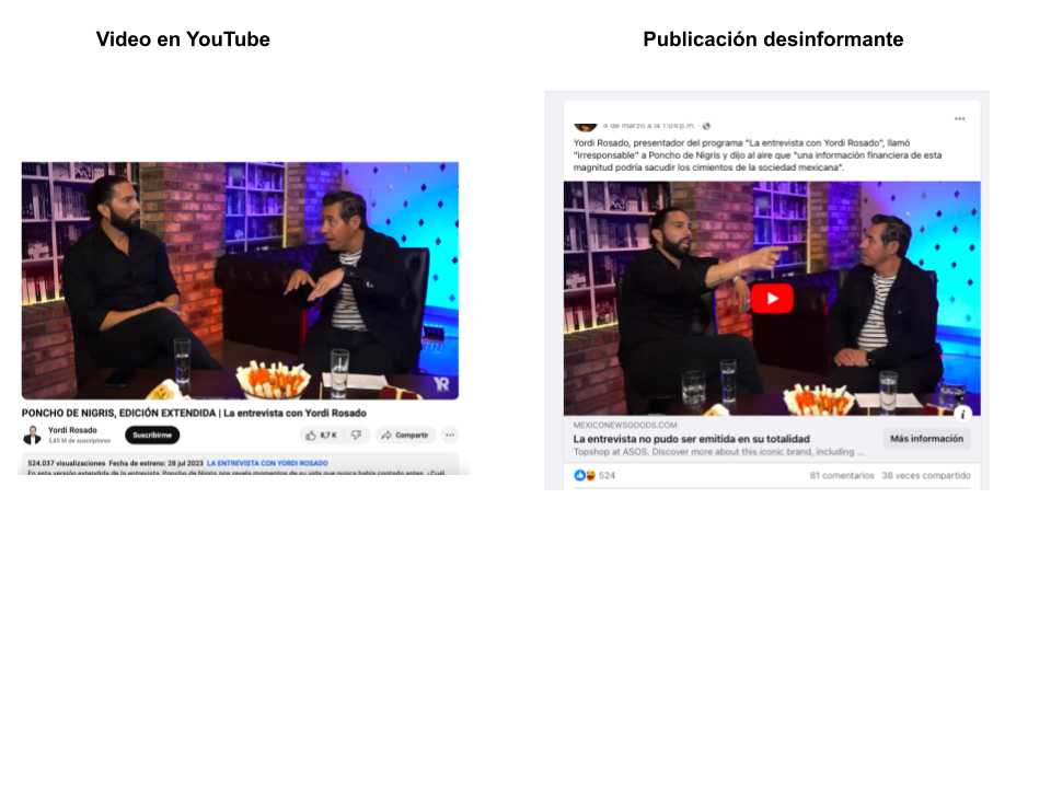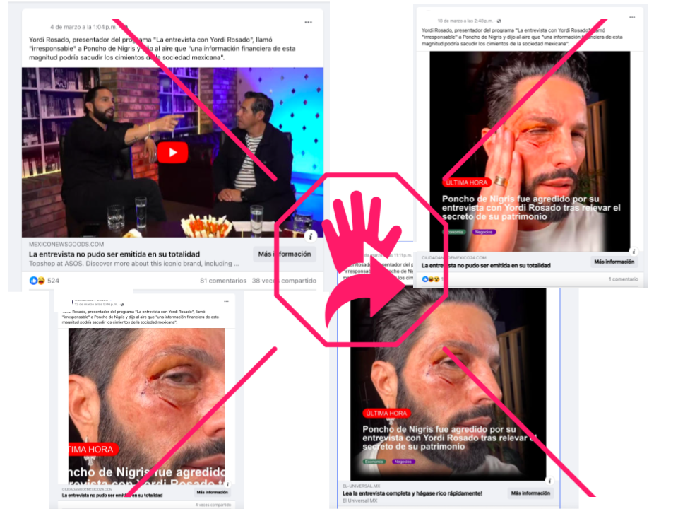 “Yordi Rosado, presentador del programa ‘La entrevista con Yordi Rosado’, llamó ‘irresponsable’ a Poncho de Nigris y dijo al aire que ‘una información financiera de esta magnitud podría sacudir los cimientos de la sociedad mexicana”, dice el texto de varias publicaciones en Facebook. Algunas llevan en la parte inferior un enlace que asegura que “la entrevista no pudo ser emitida en su totalidad” y otras dicen “lea la entrevista completa y hágase rico rápidamente”.