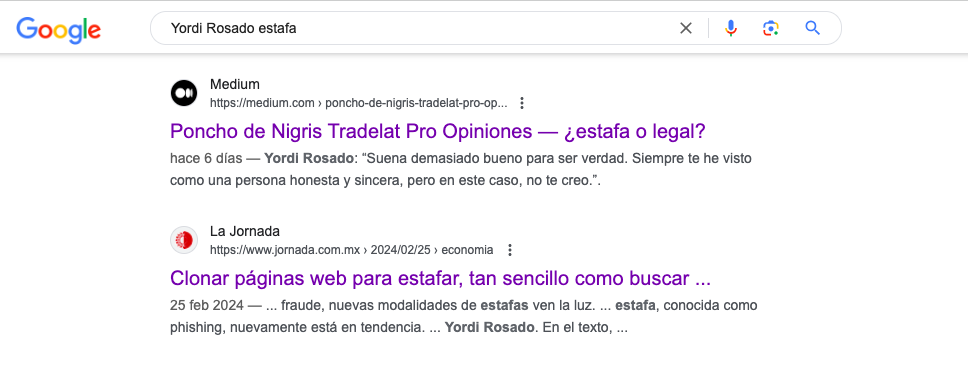 En el caso de De Nigris y Rosado, hicimos una búsqueda con palabras clave en Google y encontramos una nota del diario La Jornada de febrero de 2024 en la que se describe el mismo tipo de estafa, y en la que se menciona un ejemplo que igualmente involucra a Yordi Rosado pero en este caso con el comediante Franco Escamilla. Este trabajo periodístico detalla que también circulan este tipo de fraudes en X (antiguo Twitter).
