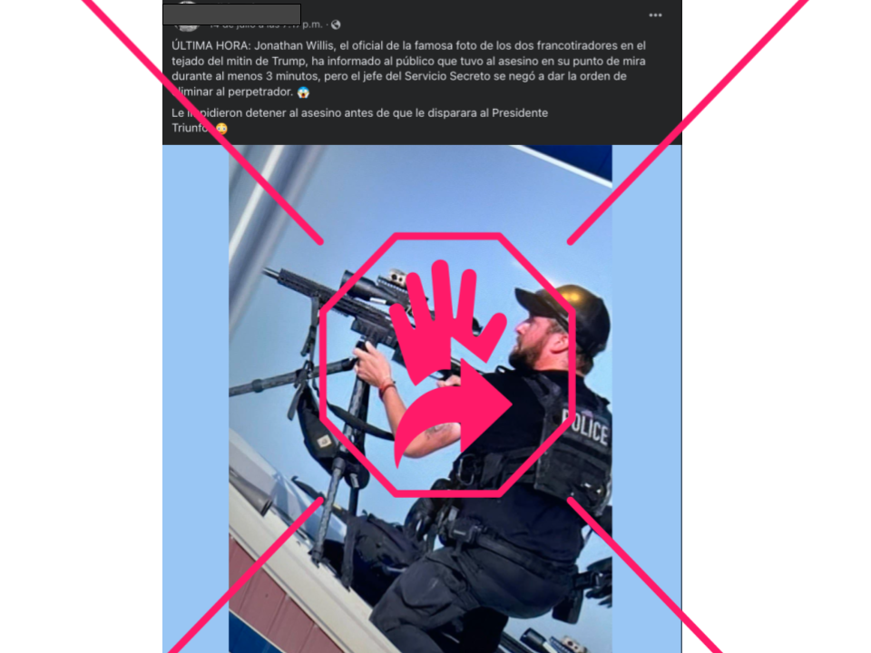 La fotografía muestra a un hombre de barba vestido de negro, con un chaleco antibalas que en la parte posterior dice “policía” (en inglés) y que está sosteniendo un arma de largo alcance. El post publicado el 14 de julio en Facebook junto con la imagen dice: “Jonathan Willis, el oficial de la famosa foto de los dos francotiradores en el tejado del mitin de Trump, ha informado al público que tuvo al asesino en su punto de mira durante al menos 3 minutos, pero el jefe del Servicio Secreto se negó a dar la orden de eliminar al perpetrador. Le impidieron detener al asesino antes de que le disparara al presidente”.