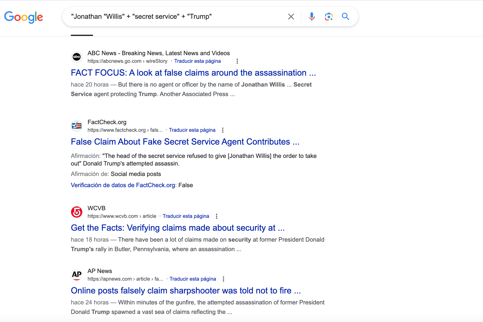 Hicimos una búsqueda con las palabras clave en Google y encontramos que Nate Herring, portavoz del Servicio Secreto de Estados Unidos, dijo a Factcheck.org, aliado del Detector, que la afirmación sobre Jonathan Willis era "categóricamente falsa" y que ninguna persona con ese nombre trabaja en ese cuerpo de seguridad.