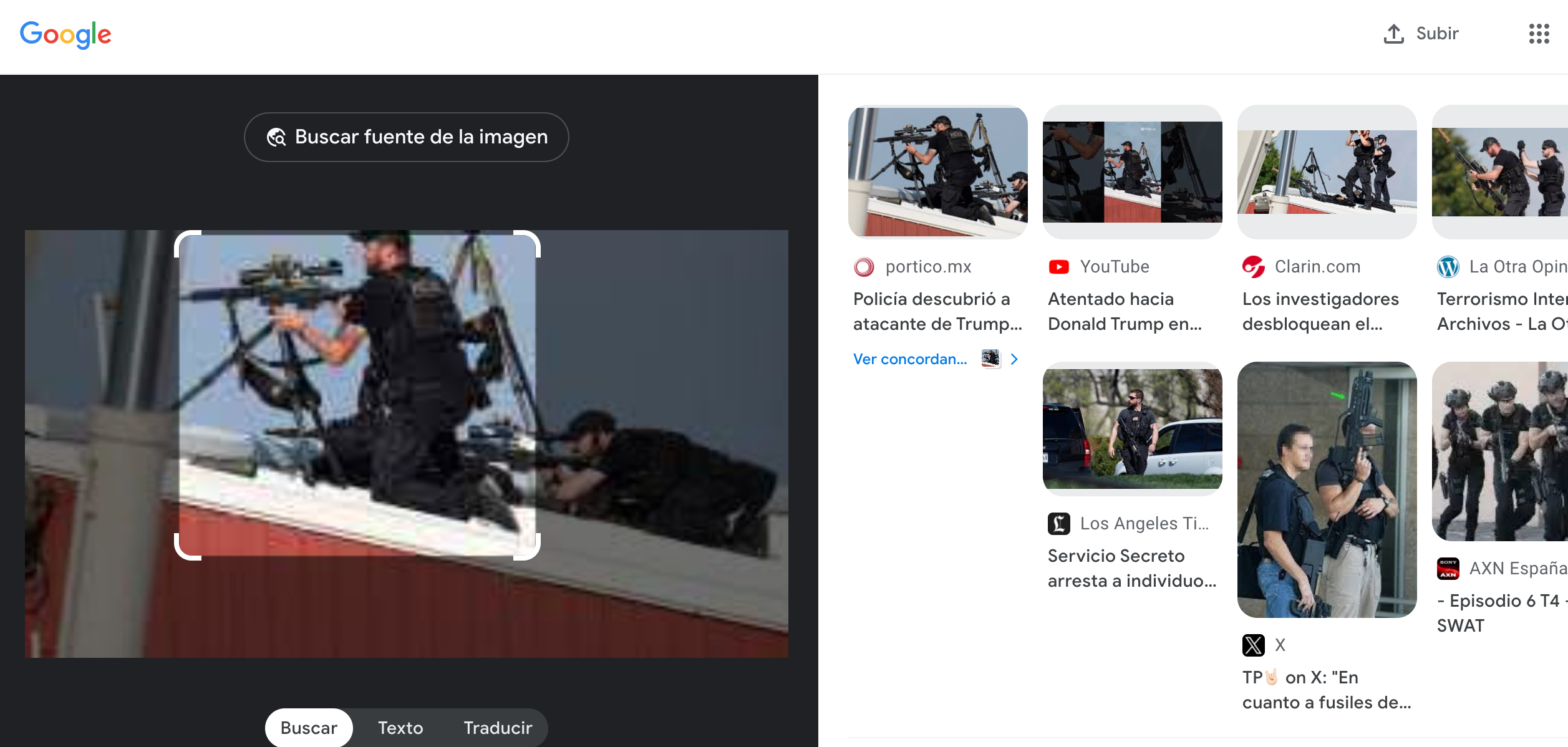 En elDetector hicimos una búsqueda inversa de imágenes en Google Lens de la fotografía del francotirador y encontramos que la misma fue capturada por el fotógrafo Gene J. Puskar para The Associated Press (AP).
