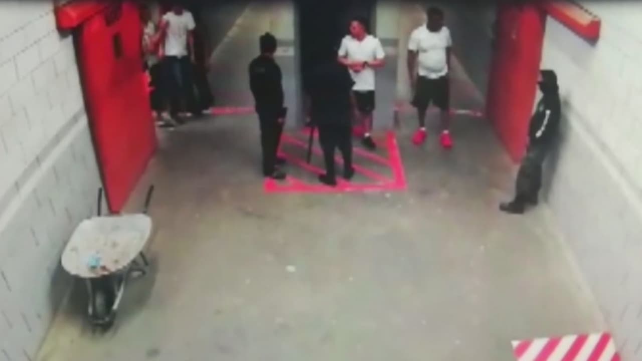 Vestido con una camiseta blanca y pantalones cortos, se puede ver a López en una cámara de seguridad mientras uno de los guardias, con capucha, camina hacia una puerta pesada de metal pintado de rojo con las llaves.