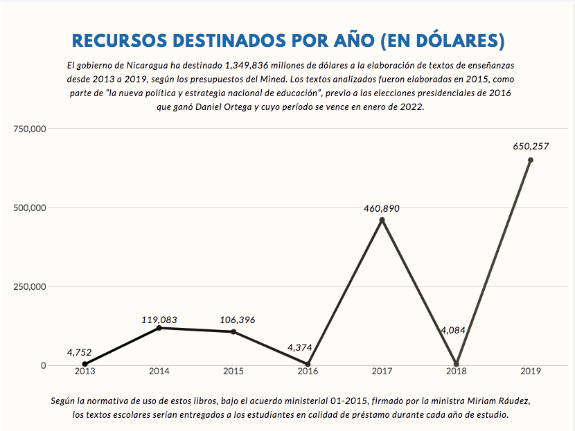 Esta investigación de NICARAGUA.CONNECTAS, la nueva iniciativa para conversar sobre lo que pasa en el país centroamericano, descubrió que en la Nicaragua de hoy, no solo es que se mencione a la familia presidencial en estos textos escolares, sino que el Ministerio de Hacienda y Crédito Público presupuestó para la elaboración de los mismos en 2019 un total 650,257 dólares. Desde 2013 hasta la fecha, la inversión en este rubro ha sido de 1.3 millones de dólares. La publicidad estatal es mostrada además en los murales de los colegios, junto a la figura del poeta Rubén Darío. En el mismo espacio se exalta también a mártires del partido de gobierno, entre ellos Carlos Fonseca, el fundador del FSLN; el hermano de Ortega, Camilo, y al poeta sandinista Leonel Rugama, mientras la bandera rojinegra es colocada siempre a la par de la azul y blanco como si una fuese la sombra de la otra.