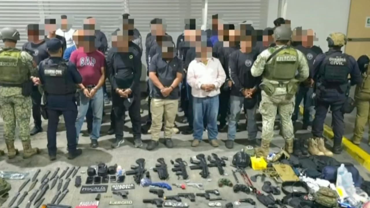 Les decomisaron una pistola calibre .9 milímetros, 19 réplicas de rifles de asalto y pistolas, así como cuchillos, equipo táctico y de radiocomunicación. Además, se localizó un camión de pasajeros marca Mercedes Benz, donde se cree se transportaron al lugar.