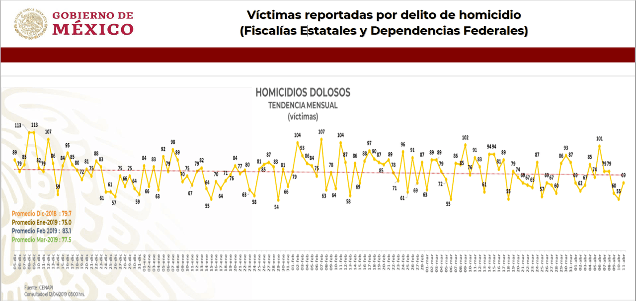 Para demostrarlo, López Obrador pidió que se proyectara en el salón de conferencias una gráfica que, según él, sustentaba su punto de vista. La gráfica (que reproducimos aquí) muestra el número de homicidios ocurridos cada día, a partir del 5 de diciembre de 2018 y hasta el 11 de abril de presente año.