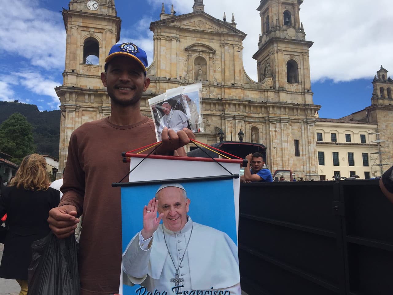 "Yo creo que su visita puede asentar el proceso de paz del presidente Santos", afirma por su parte Jorge Celis, un bogotano que vendía por 20,000 pesos (algo menos de $7) relojes labrados sobre madera con la figura de papa argentino grabada.