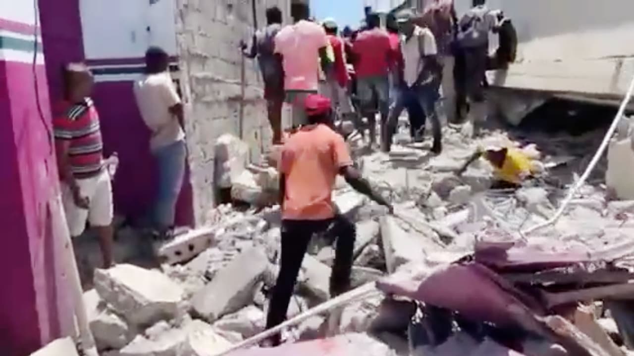 Bomberos buscan entre los escombros en un edificio colapsado en Les Cayes.