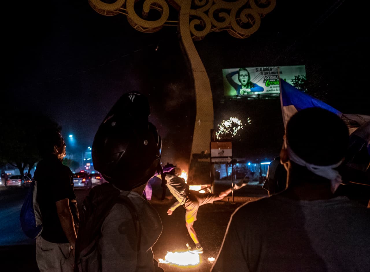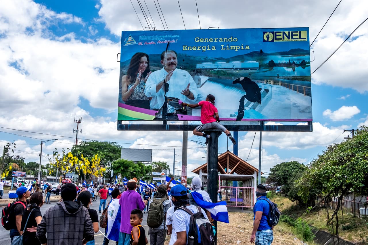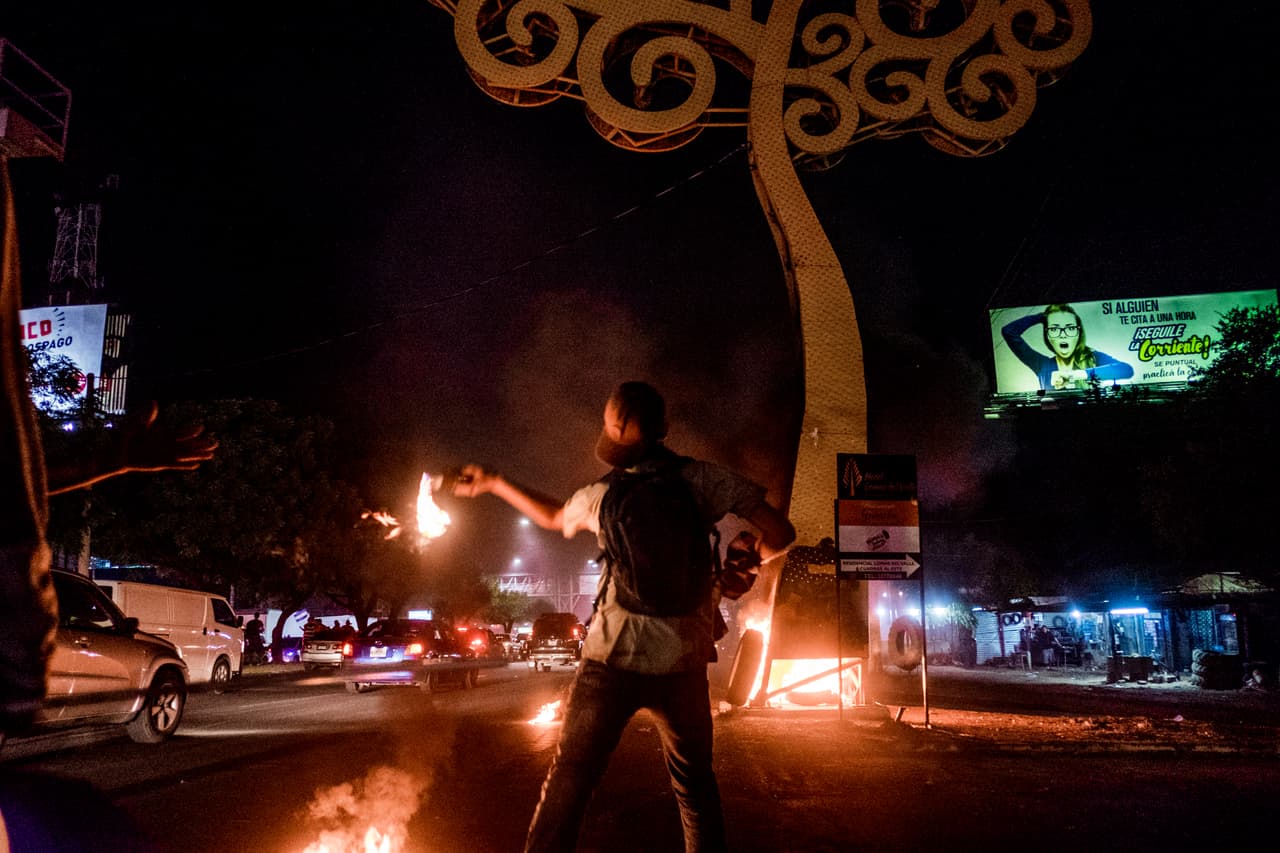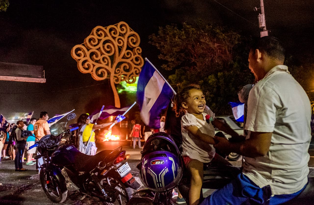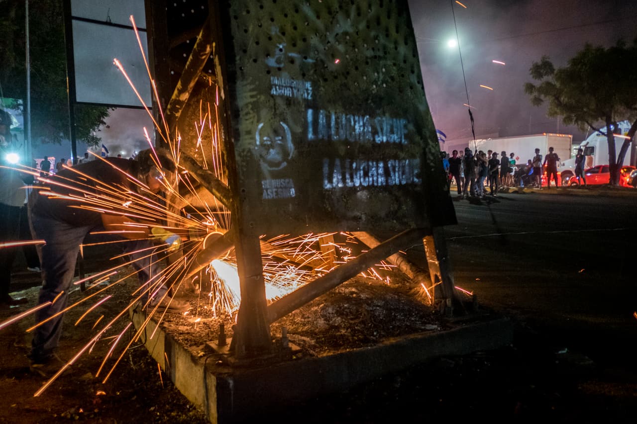 Conforme crece el rechazo al gobierno, en Nicaragua van cayendo los símbolos que lo representan. La bandera roja y negra sandinista ha sido sustituida por la azul y blanco nacional. Los manifestantes se han empeñado en derrumbar cualquier muestra de la pareja presidencial en las calles: desde las gigantografías con sus rostros y lemas hasta los ‘árboles de la vida’, unas enormes y costosas estructuras metálicas colocadas por deseo de Rosario Murillo en Managua.
