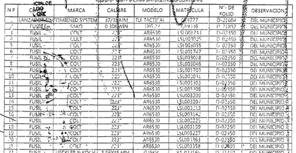 En un inventario de armas de la Secretaría de Defensa Nacional de México (SEDENA) encontradas en el arsenal de la policía municipal de Iguala, la ciudad en la que desaparecieron los jóvenes, figuran 19 rifles de modelo AR6530 de la marca Colt, una empresa estadounidense establecida en el estado de Connecticut.