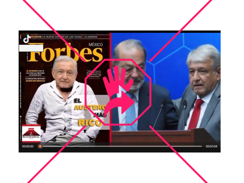 “López Obrador ingresa a la lista de Forbes como uno de los hombres más ricos de Latinoamérica en 2021”, se oye en el video, según el cual AMLO habría ocupado el puesto 28 de la lista para ese año, con una fortuna de 1,000 millones de dólares.