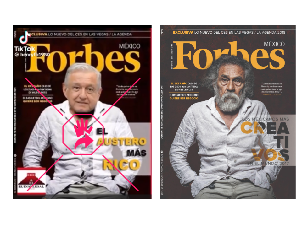 A través del chatbot de elDetector, nos consultaron sobre un video que dice, falsamente, que el presidente mexicano está entre los más ricos según Forbes. La afirmación la sustentan con una fotografía manipulada de una portada de la revista. (Haz clic aquí para chatear con nosotros y enviarnos lo que quieras que verifiquemos).