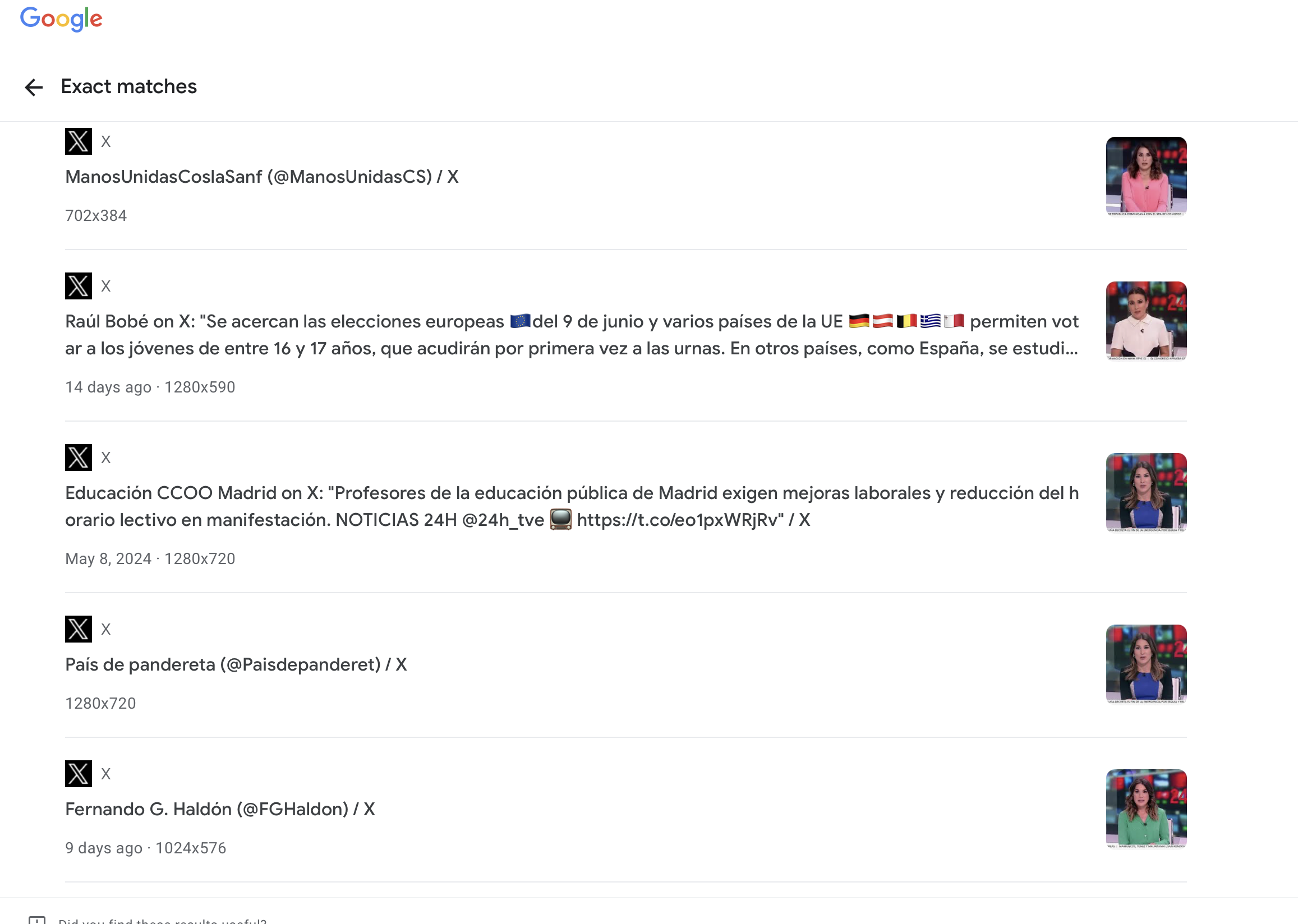 En busca del origen del clip de RTVE, realizamos una búsqueda inversa de imágenes en Google usando una captura de la presentadora. Encontramos una grabación en la cuenta de X (antes Twitter) de Manos Unidas ONGD, una organización sin fines de lucro, publicada el 20 de abril de 2024. Al comparar las imágenes, vimos que la vestimenta, peinado y fondo de la presentadora eran iguales.