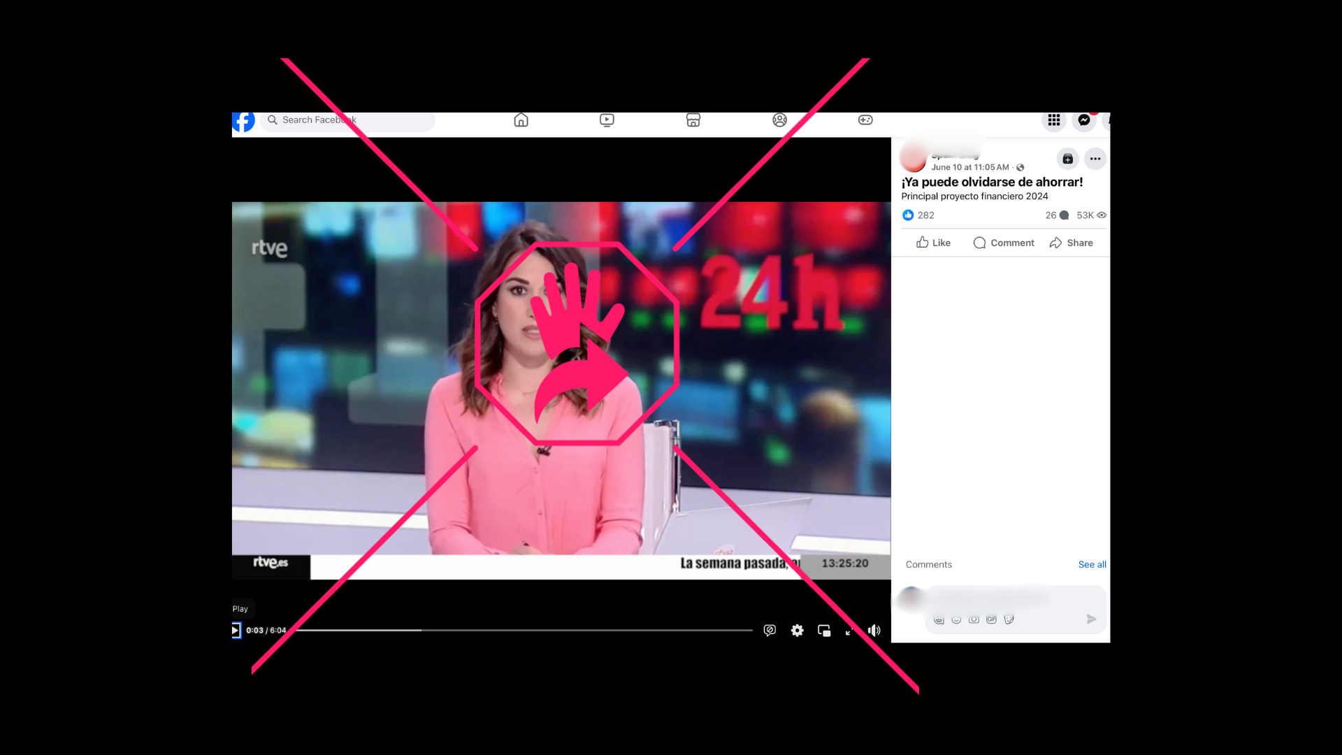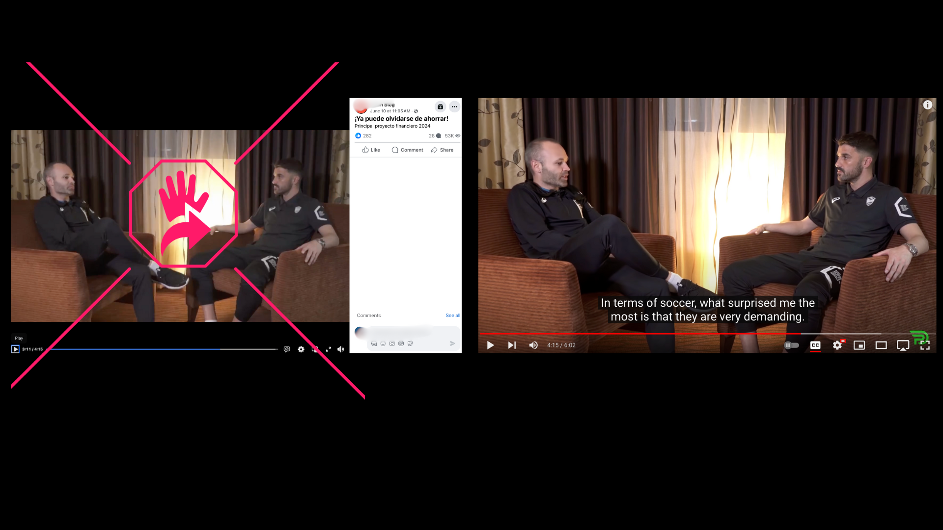 Al encontrar la grabación original, mediante una búsqueda en YouTube con los nombres de los futbolistas Andrés Iniesta y David Villa, comprobamos que el audio era diferente al del video desinformante. Si bien en la entrevista publicada en febrero de 2019 la vestimenta y el encuadre eran idénticos, en ningún momento se abordaron temas financieros, sino principalmente de la trayectoria de Iniesta como deportista y su experiencia en Japón. Tampoco se aprecia la presencia de la conductora de RTVE.