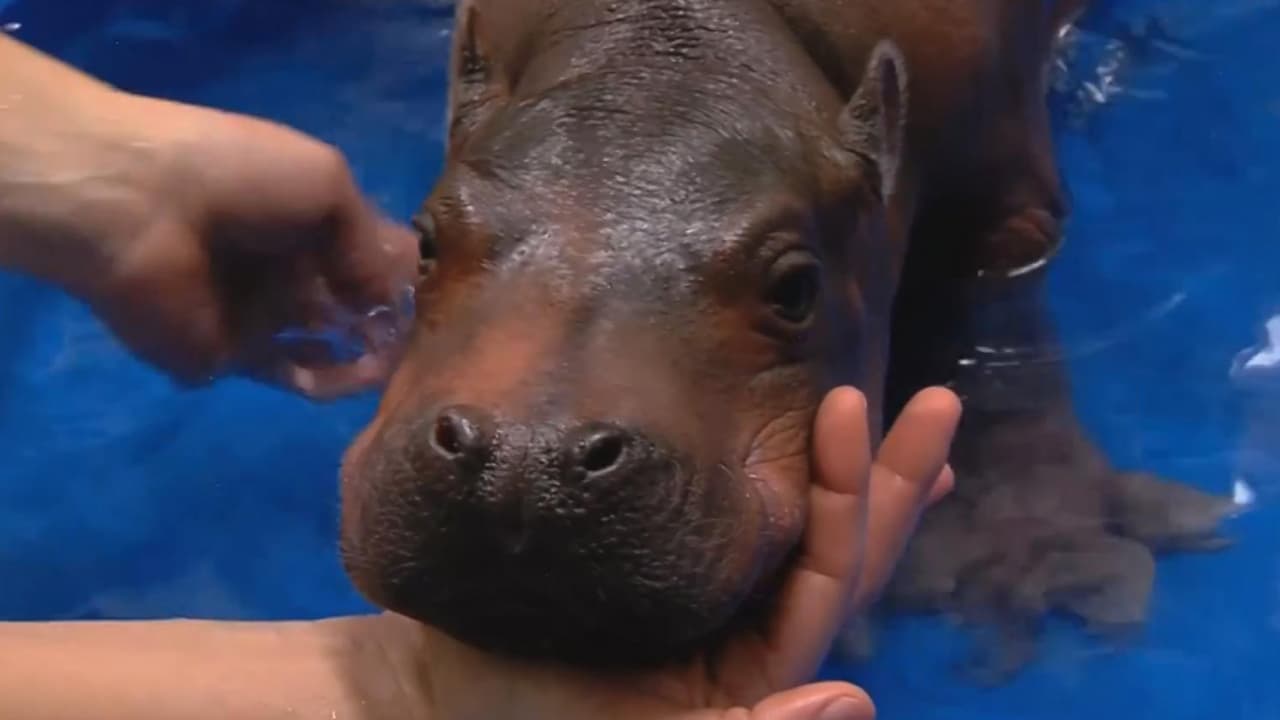 Esta pequeña nació prematura en el zoológico de Cincinnati. La mayoría de los hipopótamos nacen en el agua e inmediatamente pueden nadar, pero por su condición prematura ella no puede mantener el equilibrio. La cachorra es la primera de su especie que nace en este zoológico desde su fundación hace 75 años.