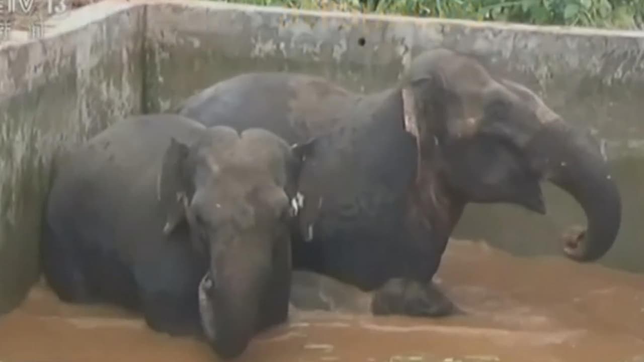 Una familia de elefantes es rescatada de un reservorio de agua en la provincia de Yunnan, después de haber permanecido atrapada allí durante dos días.
