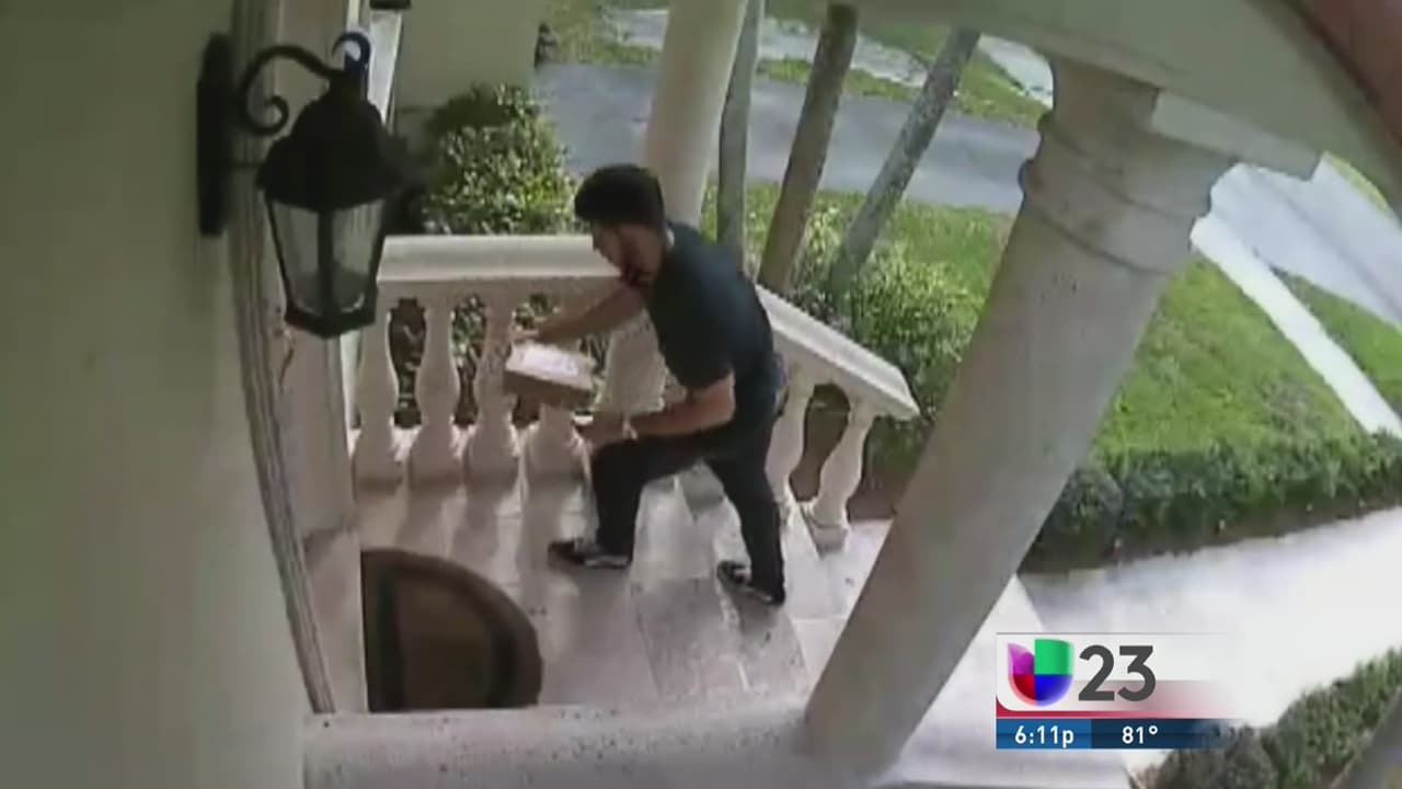 La policía dijo que tiene captado en cámara a uno de los ladrones que se roban los paquetes que son dejados frente a las puertas de las casas.