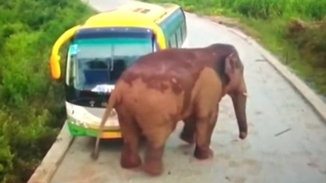 Así atacó este elefante salvaje un autobús y un camión en una carretera en China