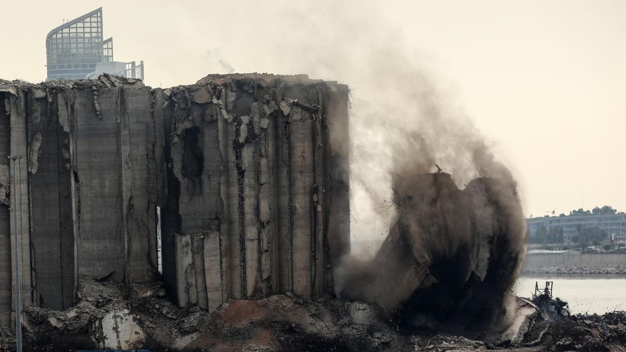 El mismo día del segundo aniversario de la enorme explosión en el puerto de Beirut, Líbano, que dejó al menos a 220 personas muertas y devastó gran parte de la ciudad, varios de los silos de trigo que resultaron dañados colapsaron.