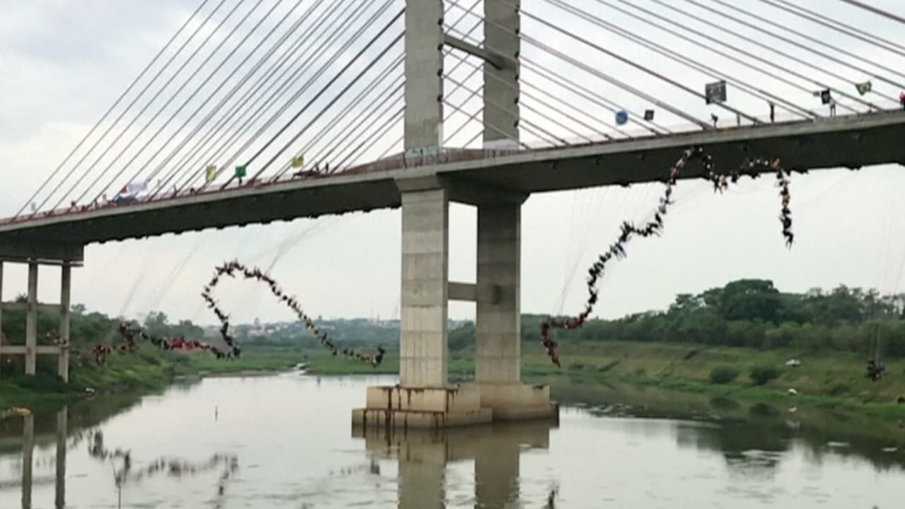 Este grupo de basileños saltó al mismo tiempo desde un puente a más de 90 pies de altura para intentar romper un récord Guinness superando la marca anterior en el mismo país. La institución aún no confirma si lograron la hazaña.