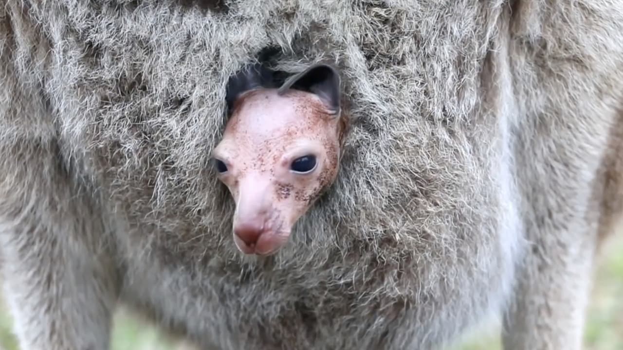 Tras permanecer cerca de ocho meses en la bolsa ventral de la madre, las crías de canguros se animan poco a poco a asomarse al mundo exterior y uno de esos extraordinarios instantes fue grabado en cámara.