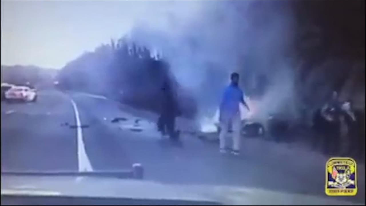 Policías de Connecticut acudieron al reporte de un accidente en una vía principal en la que un carro se incendiaba. Una persona que iba pasando ayudó en las labores. La víctima fue trasladada a un hospital con lesiones menores.