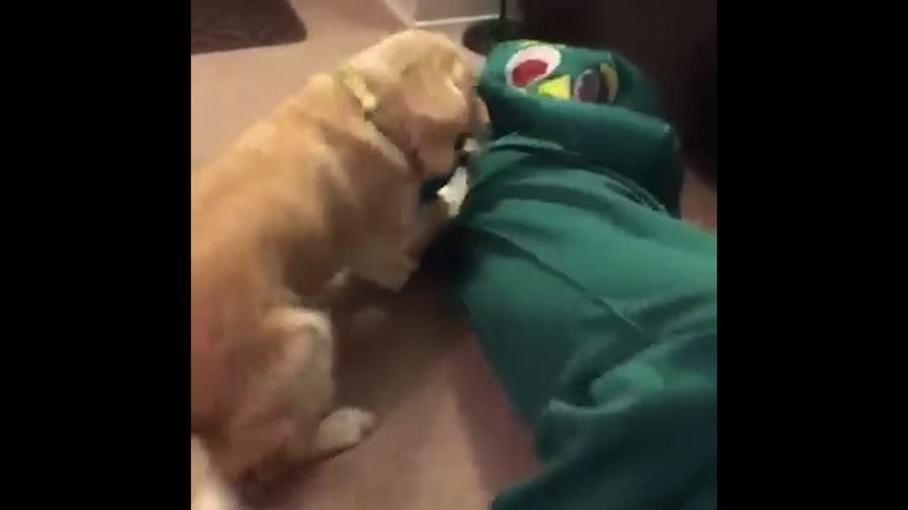 Así reacciona un perro cuando su dueño aparece disfrazado de su juguete favorito