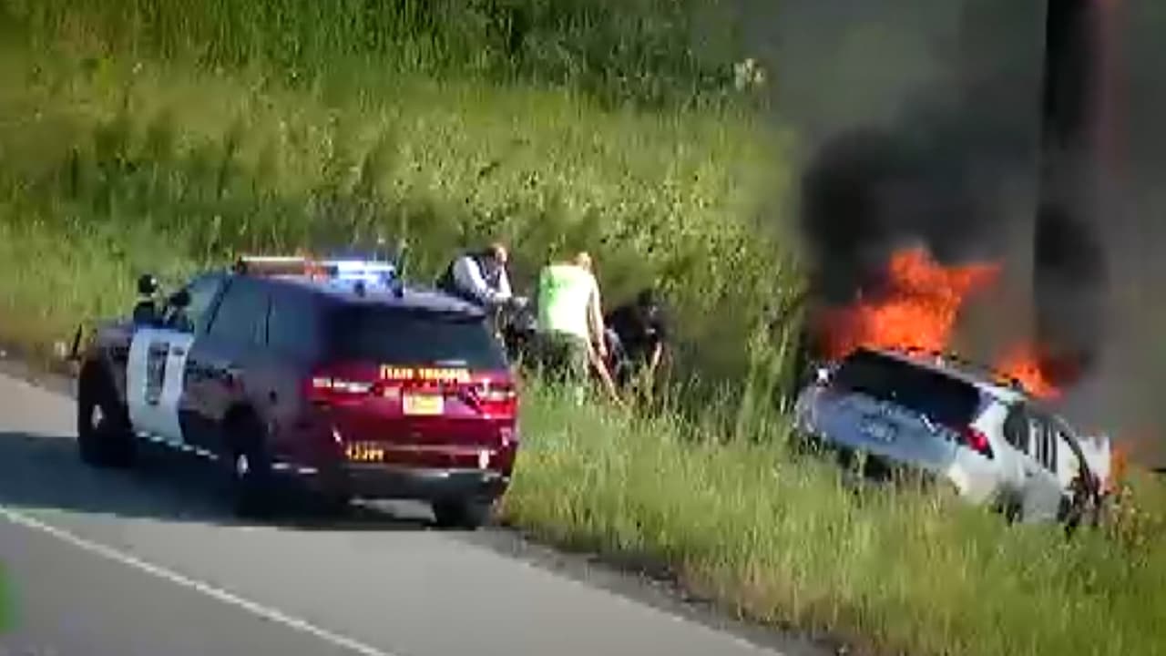 Una cámara de tránsito grabó el rescate por parte de otro automovilista y un oficial de la Policía Estatal de Minnesota, quienes lograron sacarlo a tiempo.