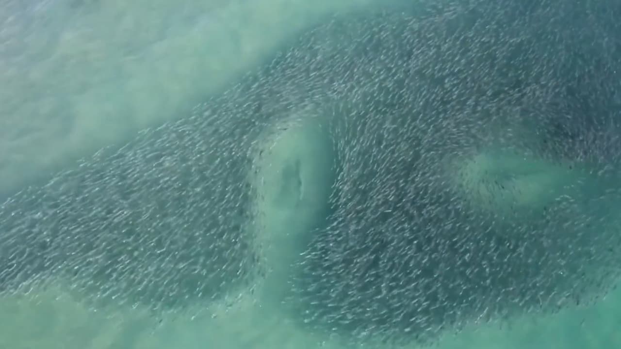 Un dron captó el momento en que un banco de mújoles que estaba migrando hacia aguas más calientes es atacado por sábalos que quieren convertirlos en su cena.