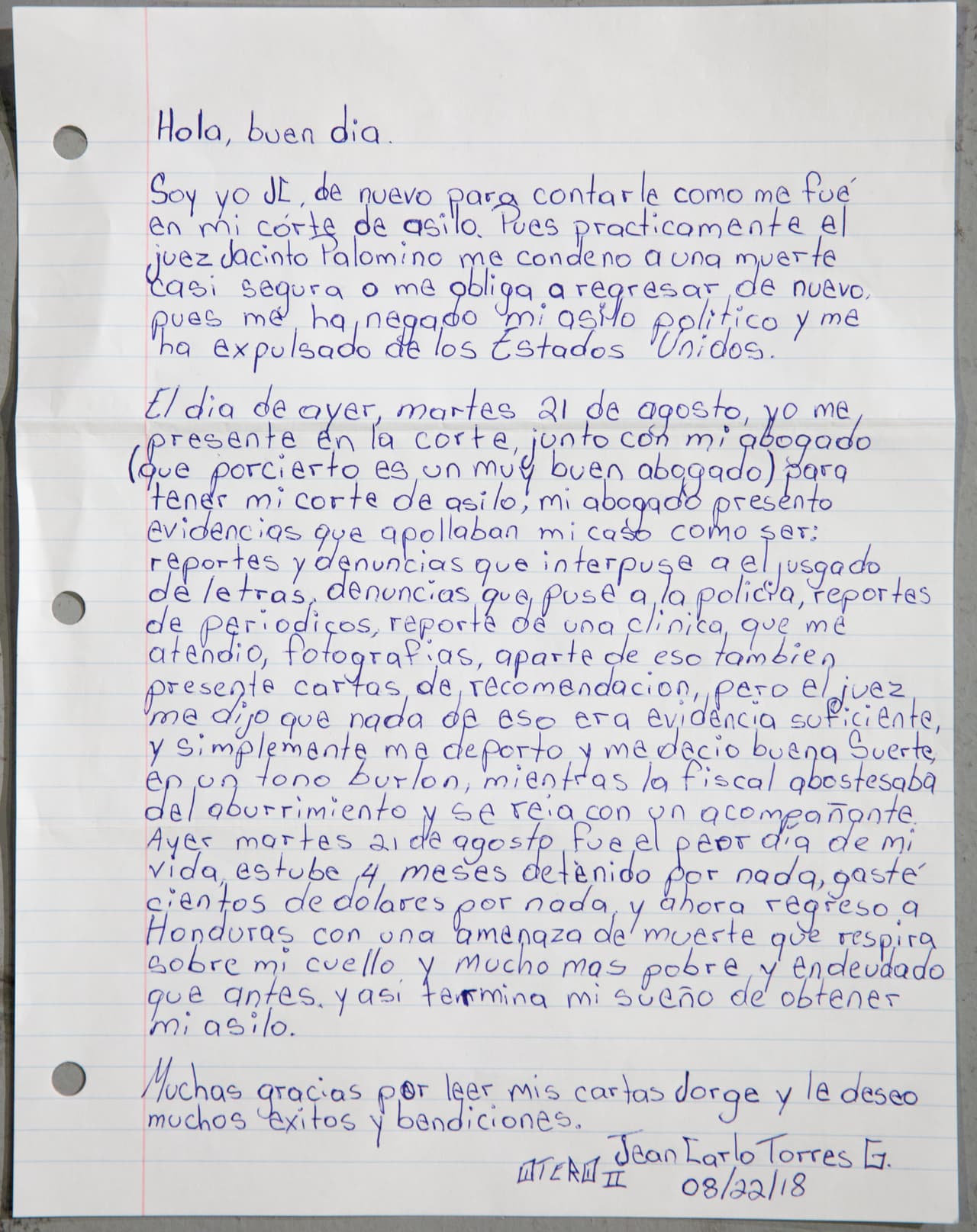 El pasado 19 de julio, el inmigrante Jean Carlo Torres envió a Univision Noticias una carta escrita de su puño y letra desde una cárcel de ICE contando su historia desde que había salido de Honduras hasta que había sido detenido en la frontera. Semanas después ha enviado una nueva carta en la que da cuenta del desenlace de su historia: su solicitud de asilo denegada, su deportación inminente.