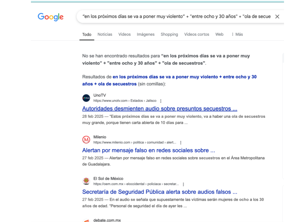 Desde elDetector hicimos una búsqueda con palabras clave en Google y esta arrojó varios reportes de medios del 27 y 28 de febrero de 2025 informando que la Secretaría de Seguridad Pública del Estado de Jalisco había aclarado que los audios advirtiendo sobre “una ola de secuestros” eran falsos.