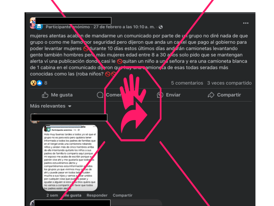 En Facebook también circula un texto que mezcla información de los audios que circulan en WhatsApp y dice que “un cartel pagó al gobierno para poder levantar mujeres durante 10 días”. Luego señala que los delincuentes “andarán en camionetas levantando gente”, en especial “mujeres de entre ocho y 30 años de edad” y finalmente asegura que “una camioneta blanca de una cabina” casi le quita “un niño a una señora”.